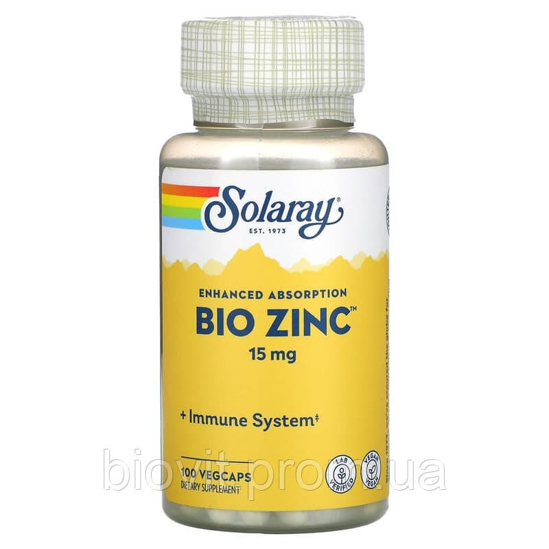 Біо цинк (Bio Zinc), Solaray - це мінеральний компонент, що виконує важливі функції в організмі людини. Він впливає на нормальний ріст волосся, нігтів, шкіри і загоєння ран, сприятливо впливає на зір. Цинк потрібен для безперебійної роботи імунної системи, він перешкоджає інфекційним захворюванням та бореться з раком. Виробник: Solaray, США Форма випуску: 100 капсул Вік: 18+ Склад: Компонент Склад 1 капсули Вітамін В-6 (як піридоксин HCl) 20 мг Цинк (цитрат цинку, піколінат цинку, ацетат целюлози цинку) 15 мг
